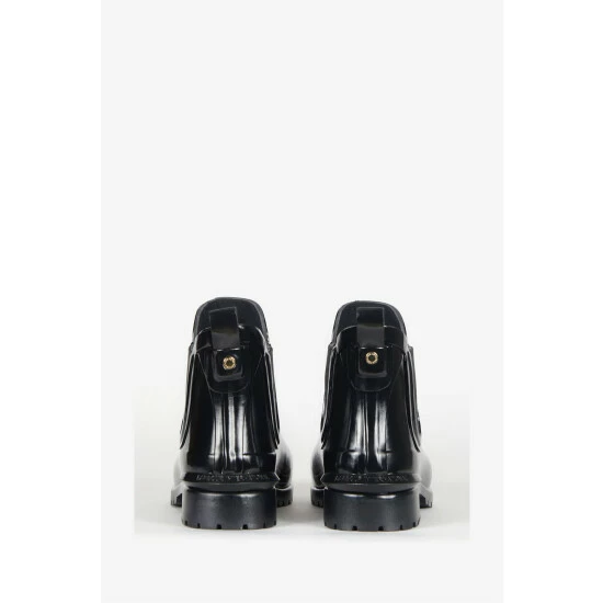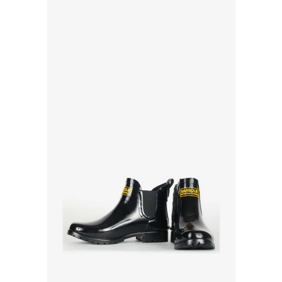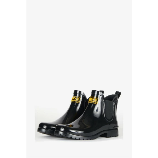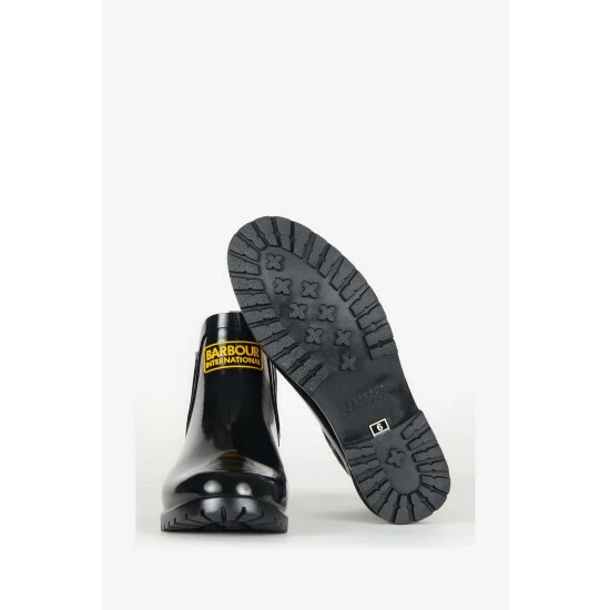 A fashionable, Chelsea style wellington boot in a metallic finish, featuring the classic Barbour® International branding.