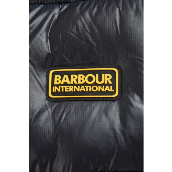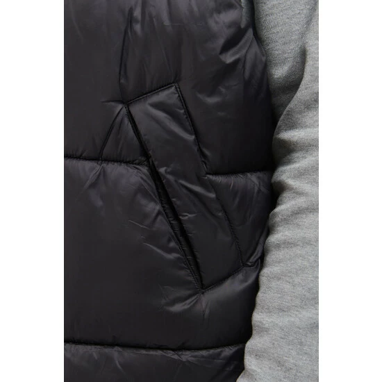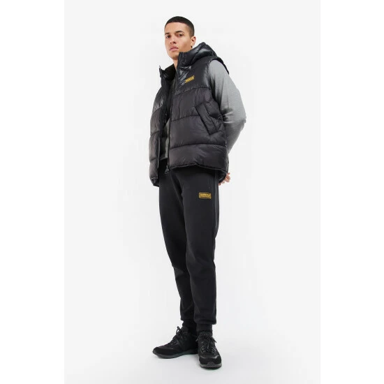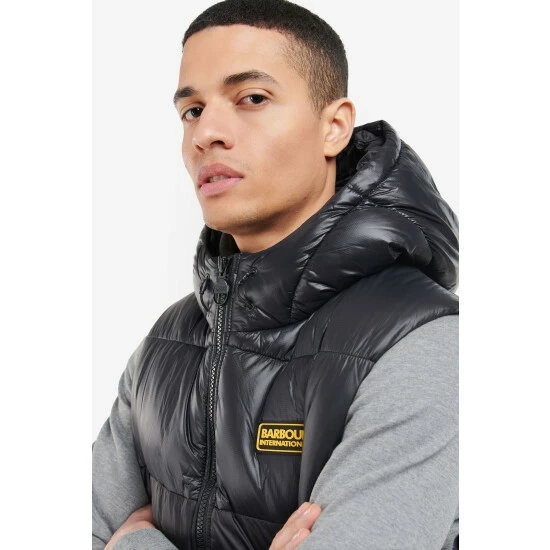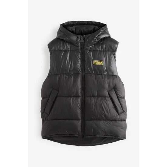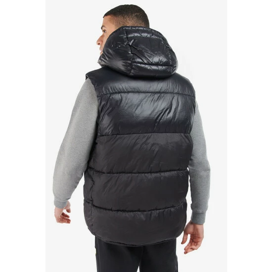 Baffle quilted gilet with fixed hood and zip-front fastening. This style features contrast lower body fabric, angled storm-welt pockets and adjustable hood and waist.