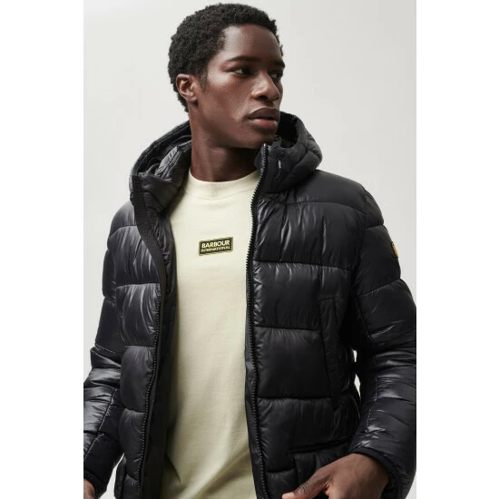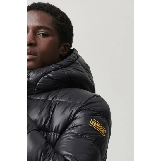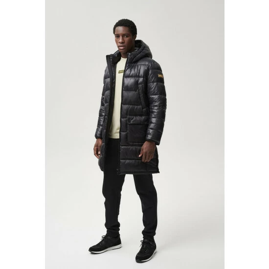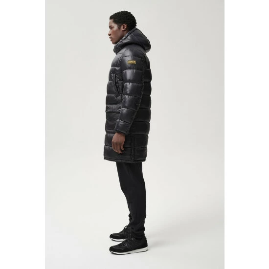 Longer length baffle quilted parka with fixed hood and zip front fastening. This style features contrast upper-body fabric, storm welt pockets, lower patch pockets and lycra bound cuffs.