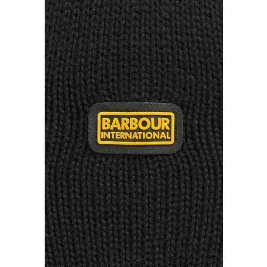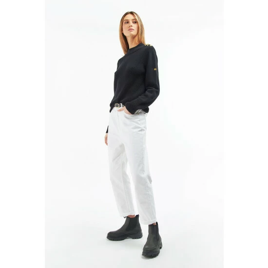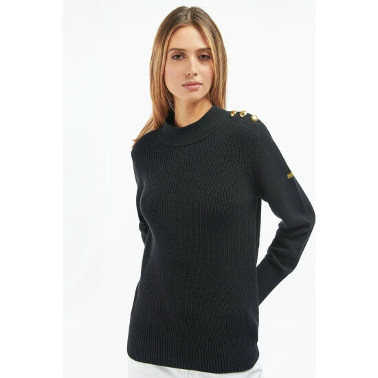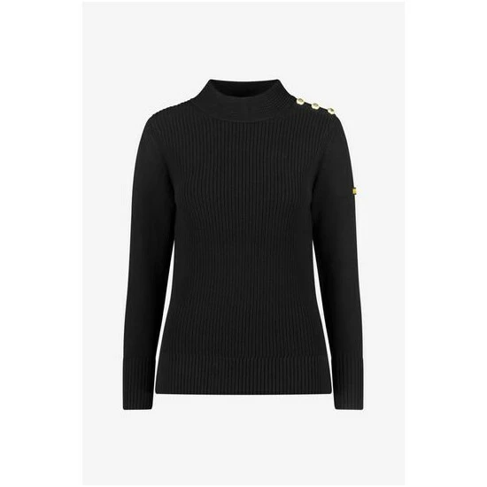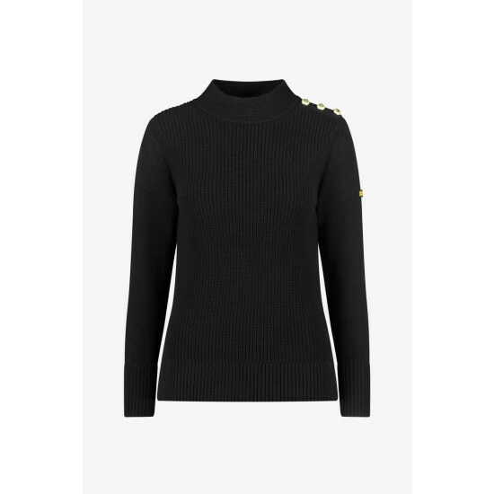 Cotton knit with funnel neck and full length sleeves. Features a ribbed body, plain knit sleeves and placket with branded BI buttons on left shoulder.