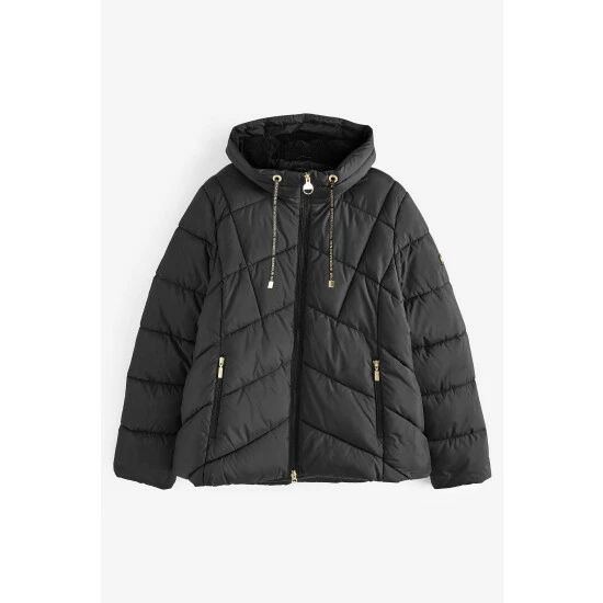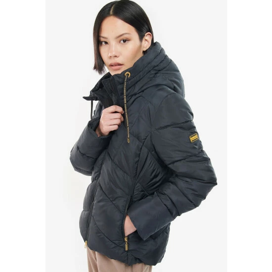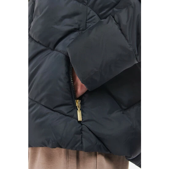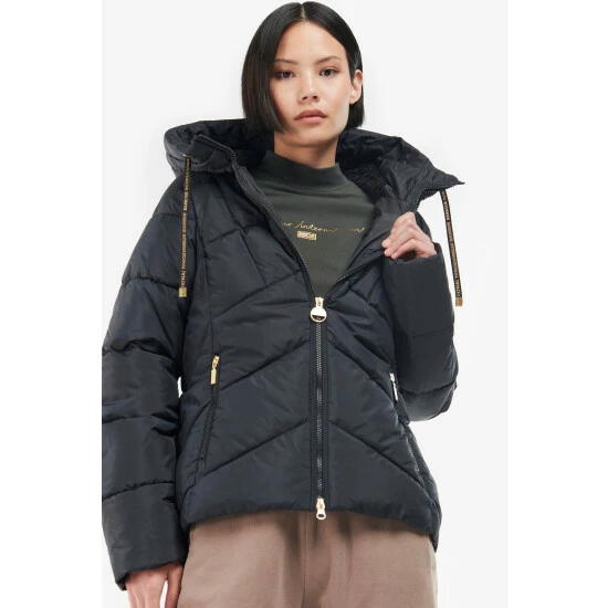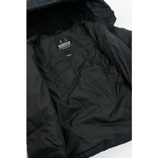 Sporty shorter length quilt with fixed snorkel hood, black contrasting zips and branded drawcord.