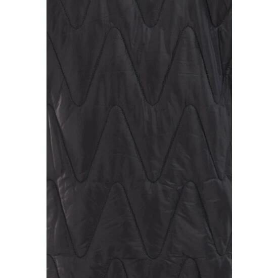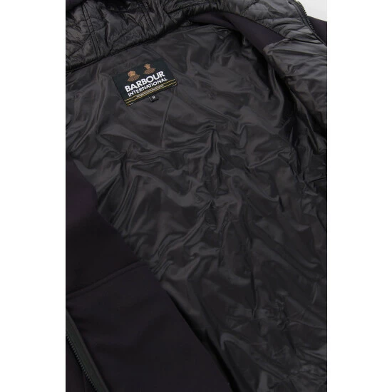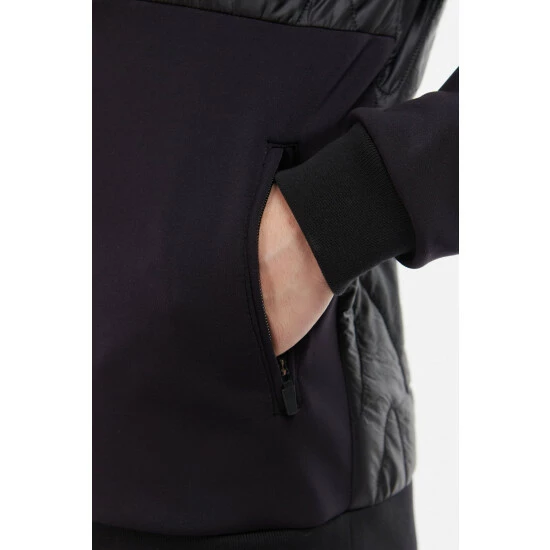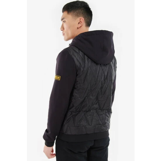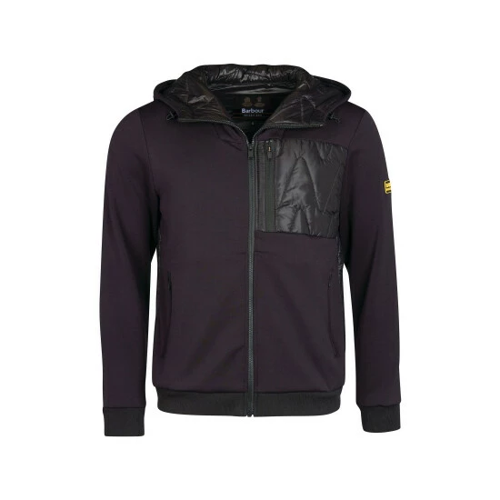 Long sleeve, double-knit sweatshirt with studded-front fastening, rib cuffs and hem. This style features a baffle-quilted front and rear yoke detailing with a drawcord through the hood.