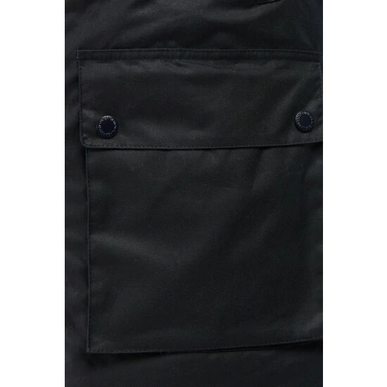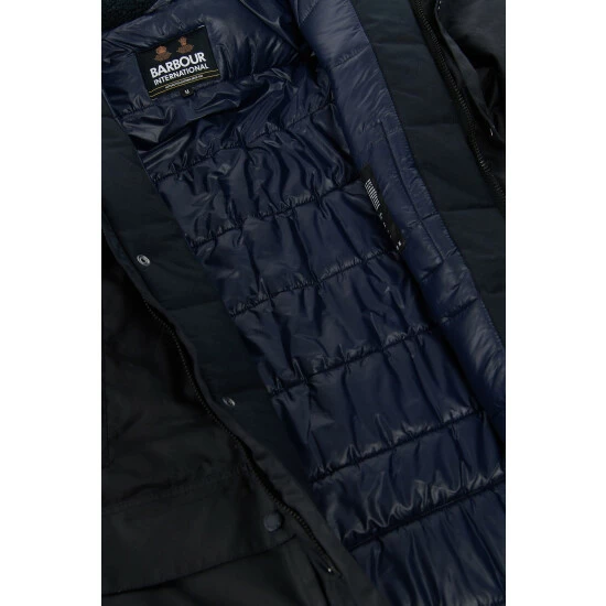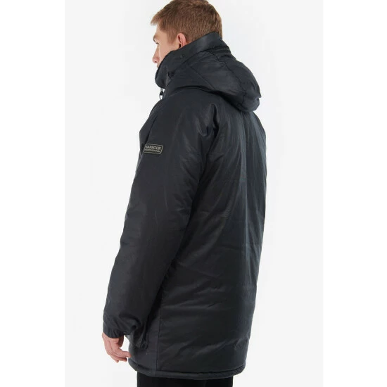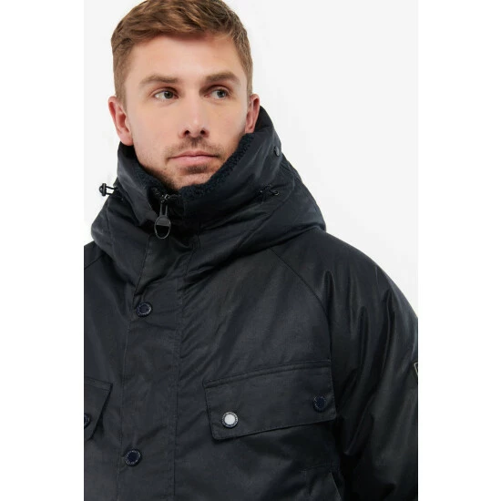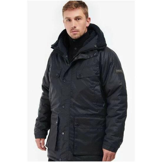 The Barbour International duke parka wax jacket boasts a fixed hood with a detachable fleece trim for premium comfort and offers a branded tape detail. Showcasing a baffle quilt lining for extra warmth, this jacket boasts chest, hand warmer and lower pockets for premium storage space. This jacket is effortlessly finished with a Barbour International badge to the left sleeve.