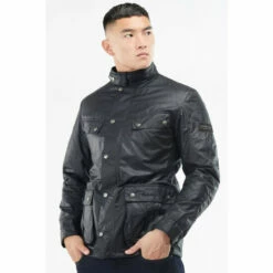 The Barbour® International duke wax jacket boasts self-fabric overlay elbow patches, two lower bellow pockets and two chest welt pockets. This garment offers a quilted lining and is finished with a branded silicone badge on the left arm.