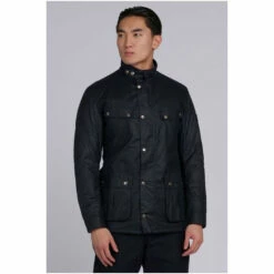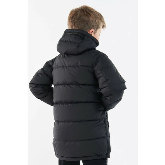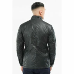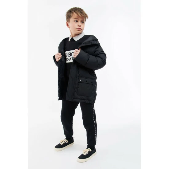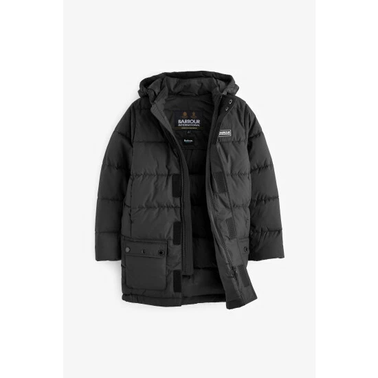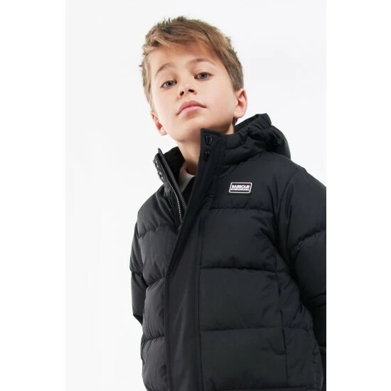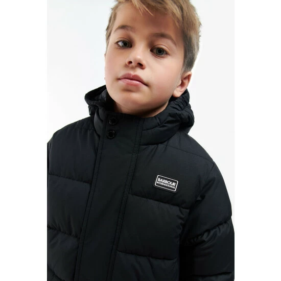 Baffle quilted jacket with fixed hood, zip fastening and stud front placket. This style features side entry hand warmer pockets, lower patch pockets and hood tape detail.
