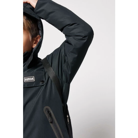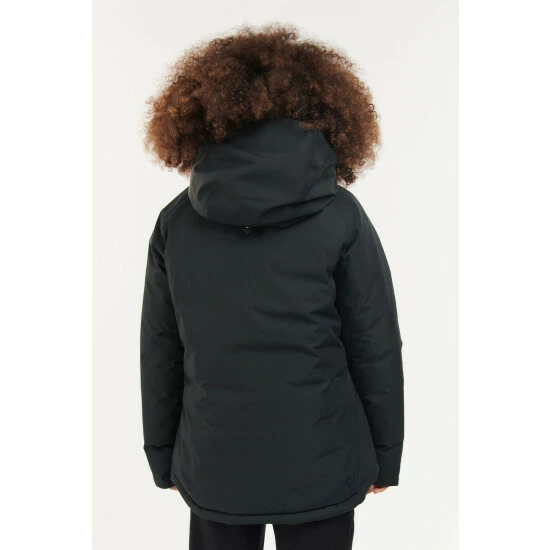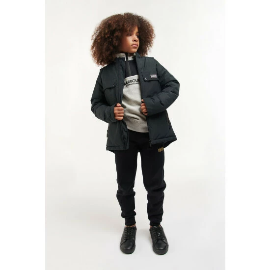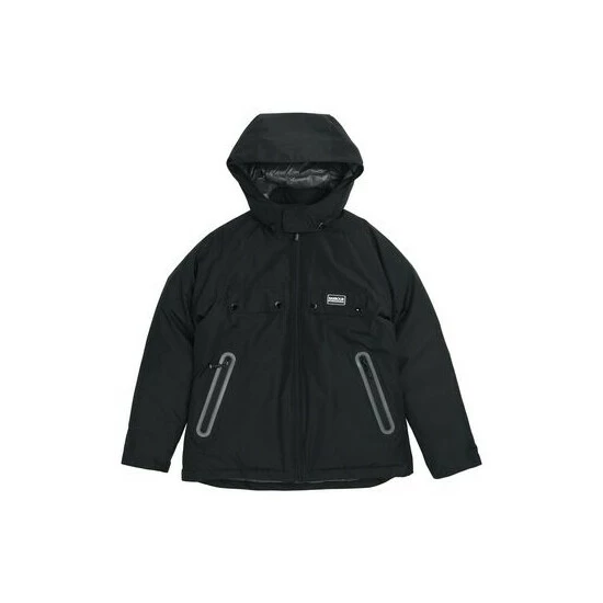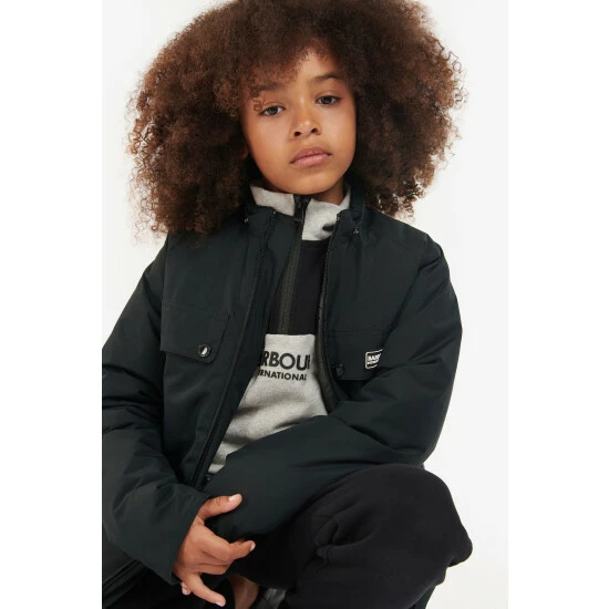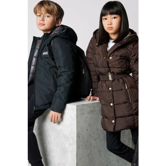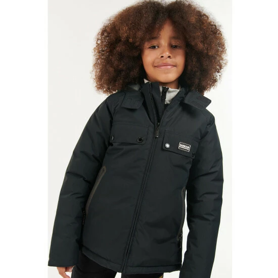 Boys showerproof jacket with detachable hood and zip front fastening. This style features baffle quilted lining, chest pockets and lower angled zip fasten pockets.