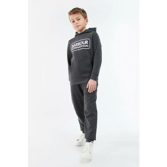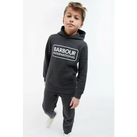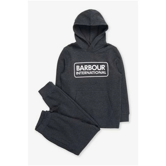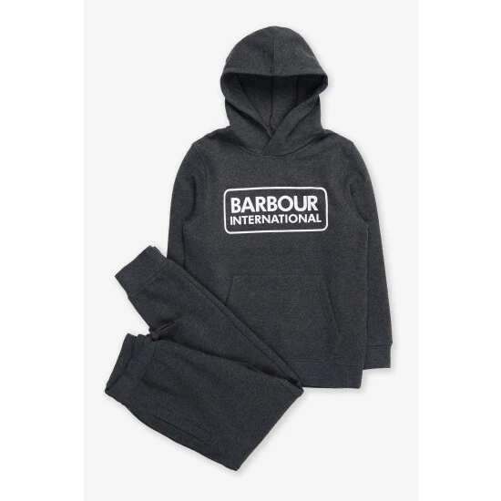 Boys Barbour International Essential hoodie and track pant set with Barbour International print to chest and leg.