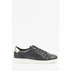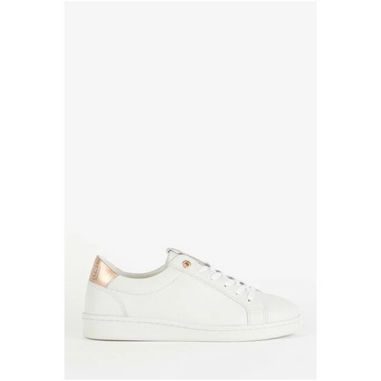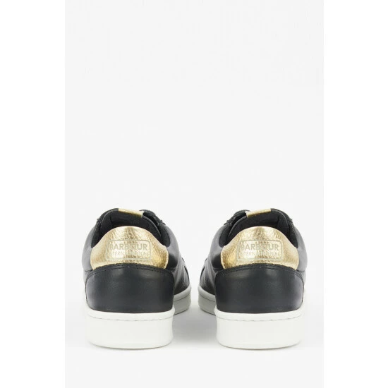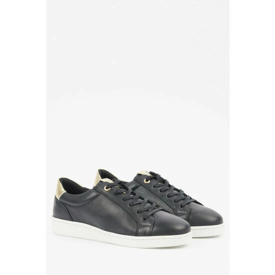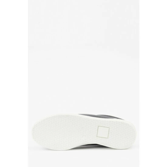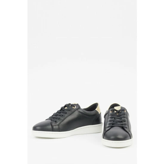 A contemporary sneaker set on a sleek cupsole, features contrast metallic leather branding details.
