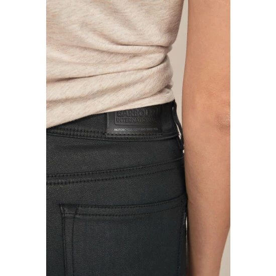 Five pocket, rinse wash jean in Reform 360 stretch denim. Stay black. Signature Barbour International details, branded jeans button, rivets and zips to cuff.