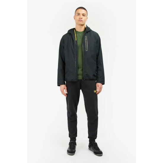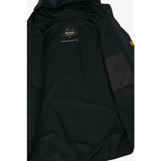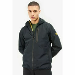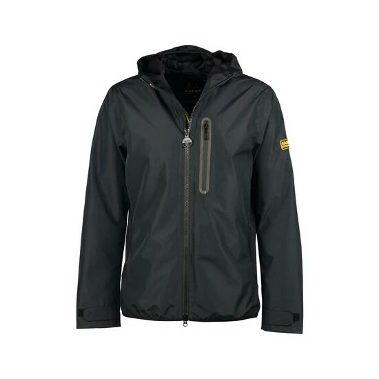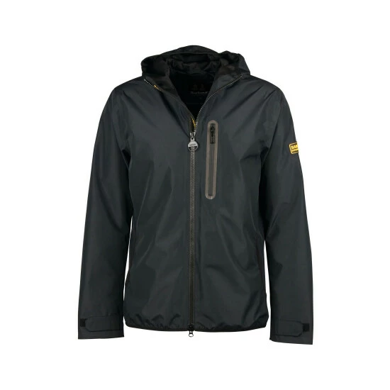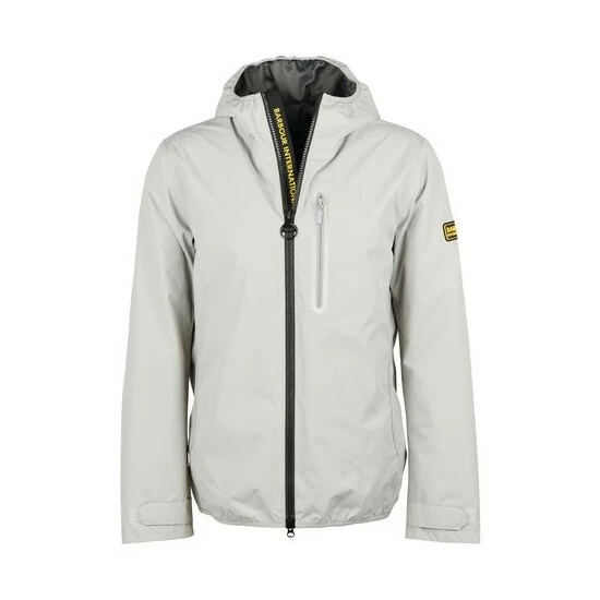 Waterproof jacket with fixed hood and zip-front fastening. This style features a chest zip pocket, lower side-entry pockets with bound edge and adjustable Velcro cuffs.