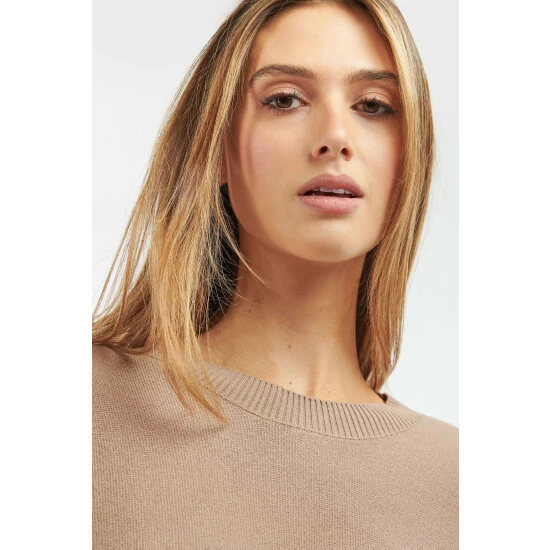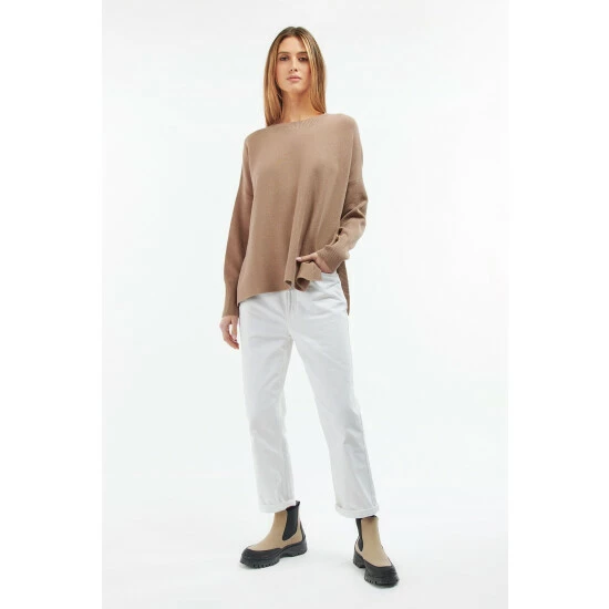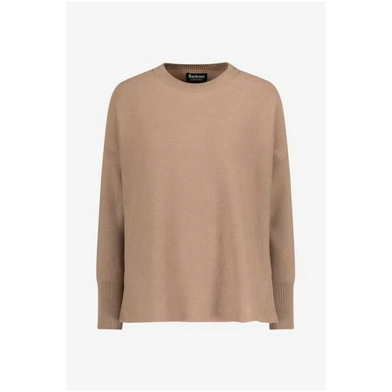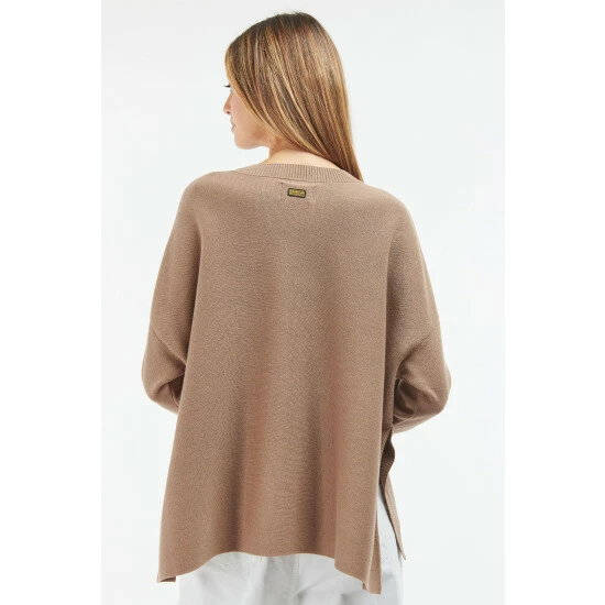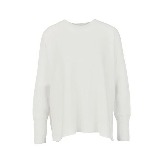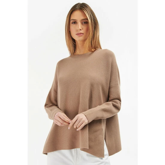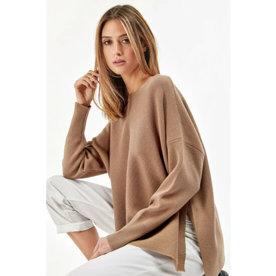 Oversized knit with dropped armhole sleeve, crew neck and rib cuffs. Features deep side splits with ribbed border and branded buttons at the side seam.