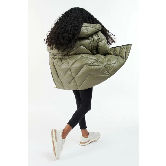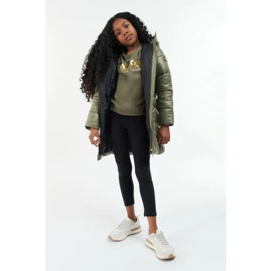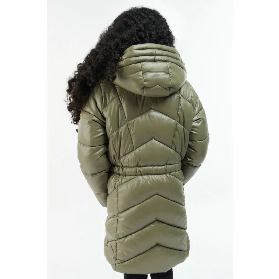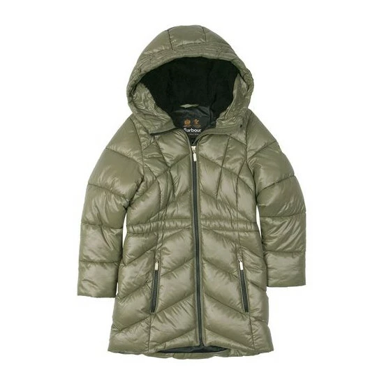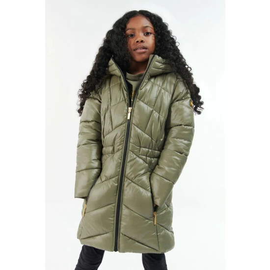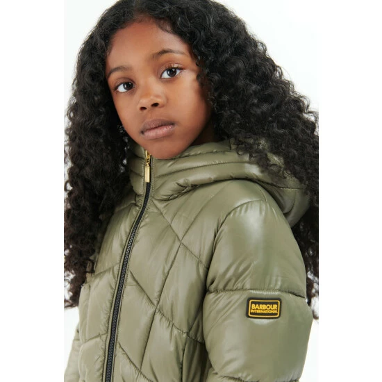 The Barbour® International girls’ Salta quilted jacket boasts a longer line chevron quilted design with an elasticated waist for fit. This style also features a faux fur lined grown on hood and zip pockets for handy storage space.