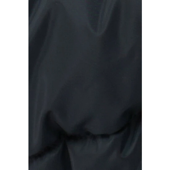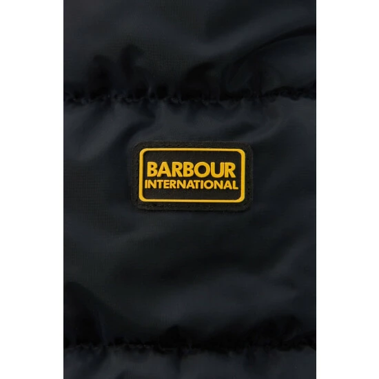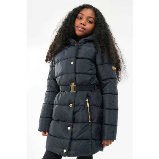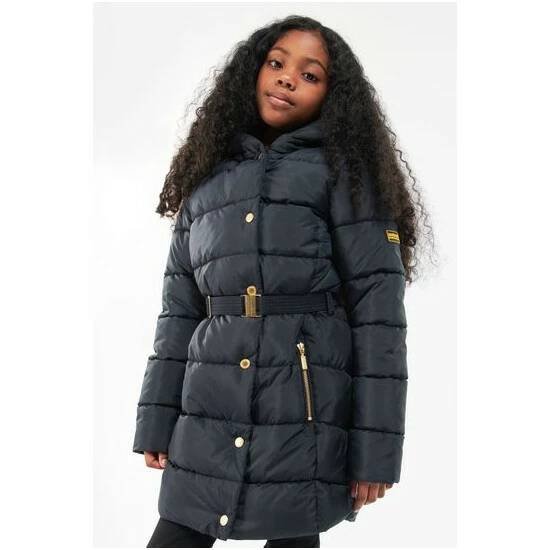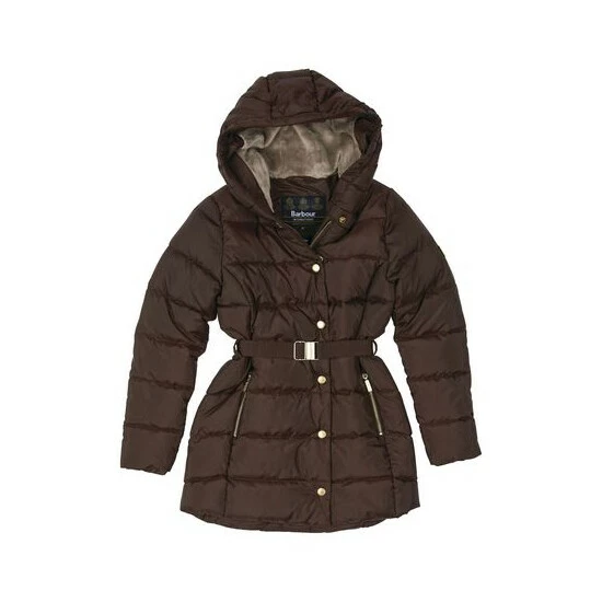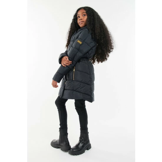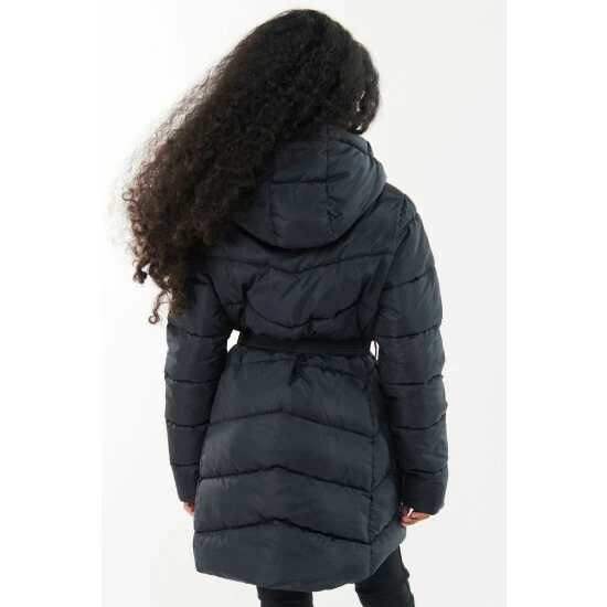 Long line quilt with wrap hood and centre front placket. Elasticated belt to waist for fit, zip pockets, baffle quilt to front and chevron quilt to back.