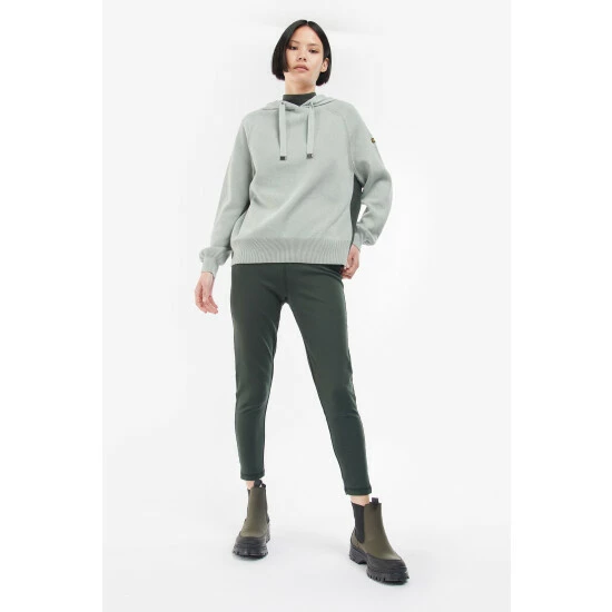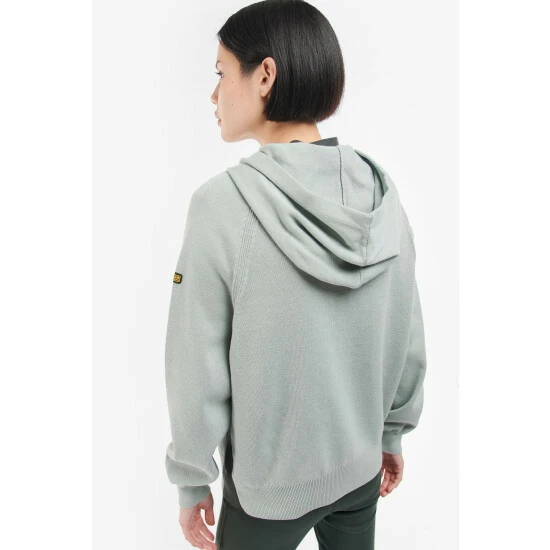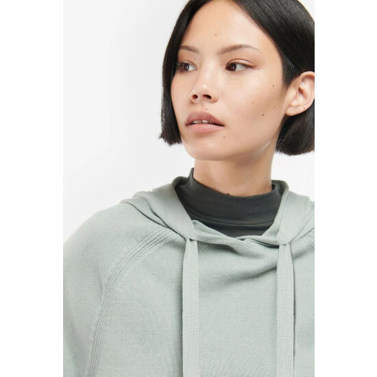 Pop-over knitted hoodie in half Milano stitch with raglan sleeves and ribbed trims at cuffs and hem. Features contrast colour stripe at side seams and branded drawcord ends.