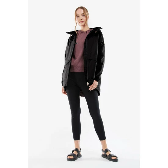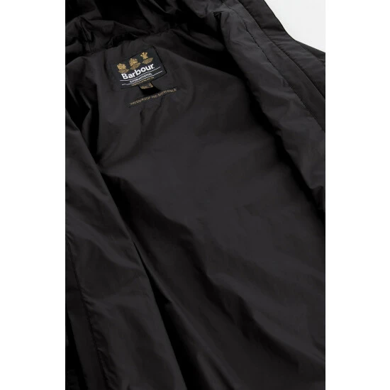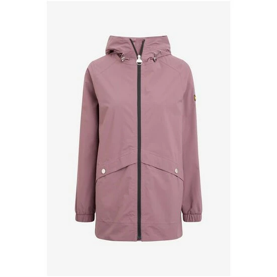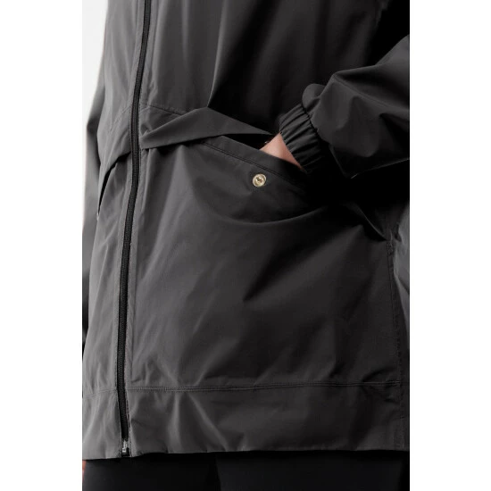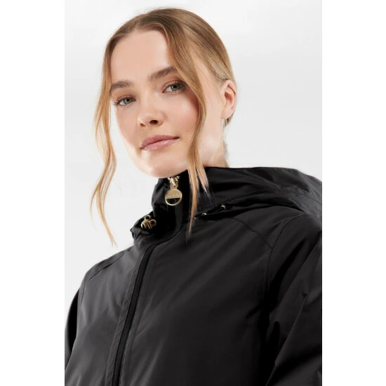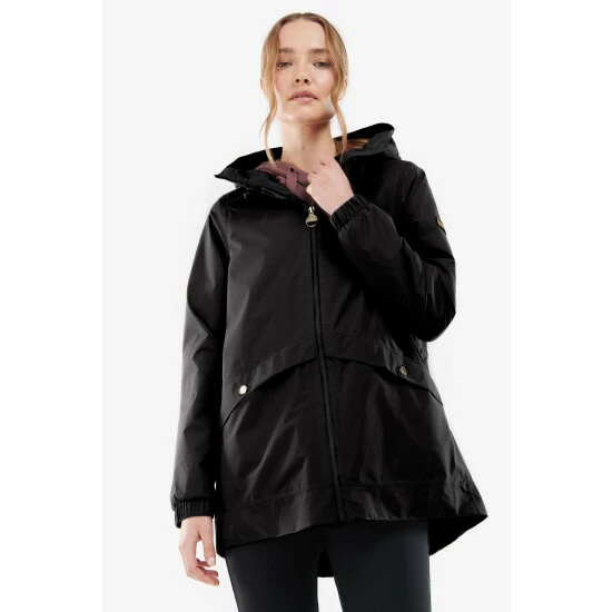 Shorter length waterproof style with a fixed hood, stud pockets and elasticated cuffs. Featuring a back waist drawcord and dipped hem.