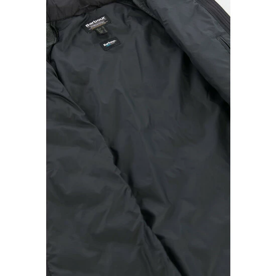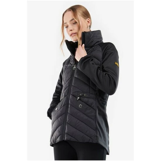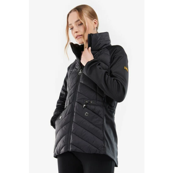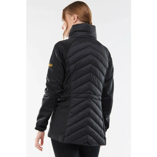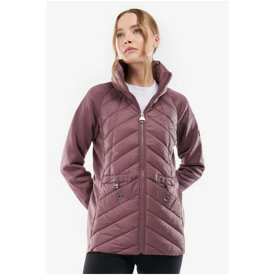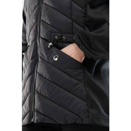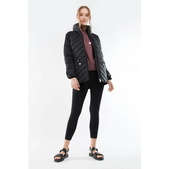 Quilted sweat style with funnel neck, waist drawcord, stud pockets and stretch binding detail to cuffs.