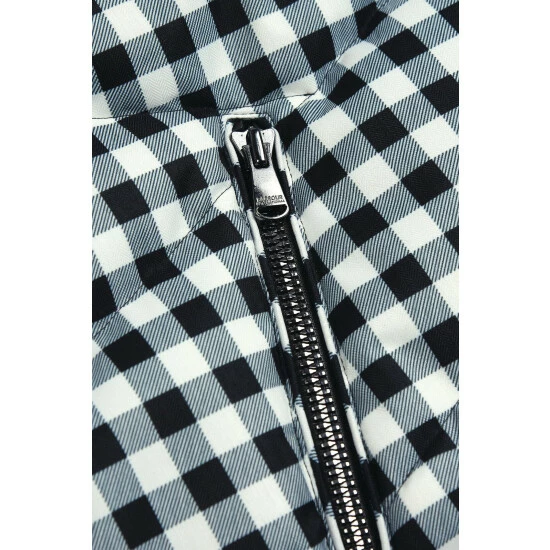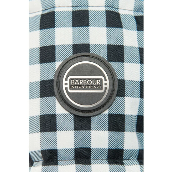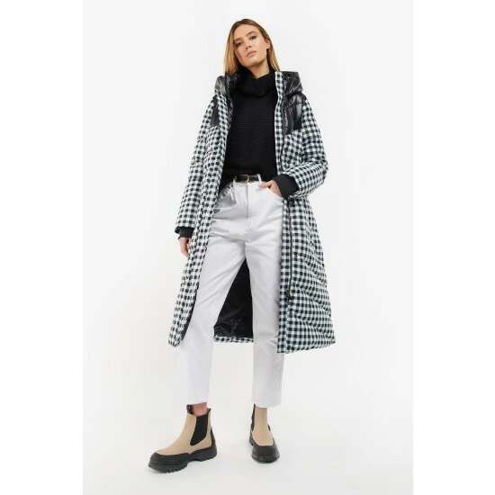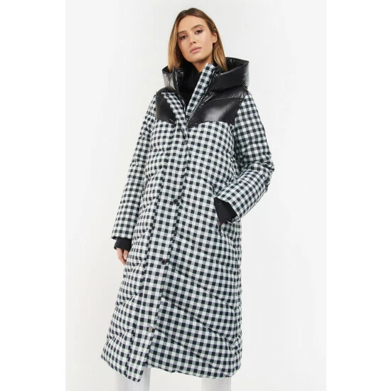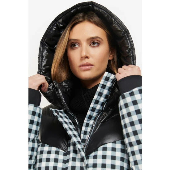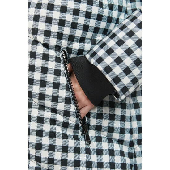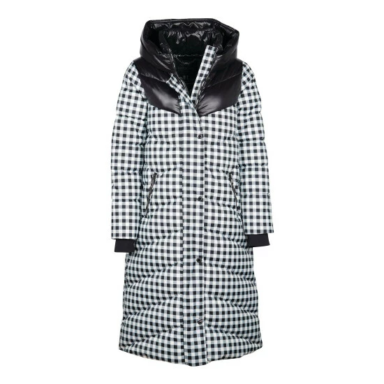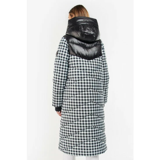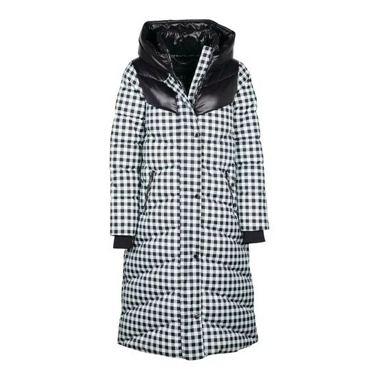 Longer length, check quilted style with contrast shine panels, fixed hood, rib cuffs and zip pockets.