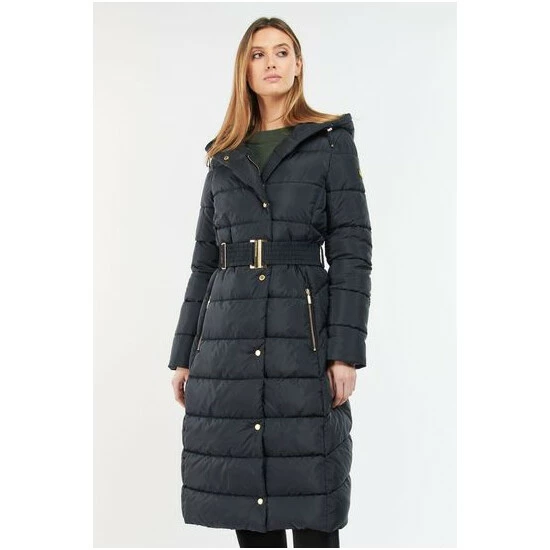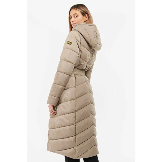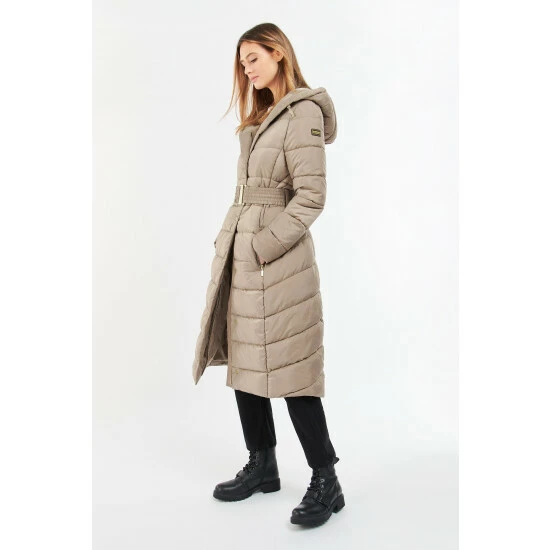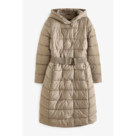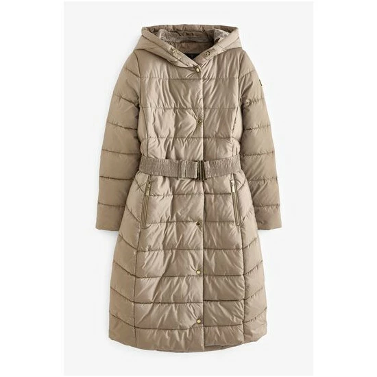 Longline style with wrap hood, zip pockets and elasticated belt to waist. Straight baffle quilting to front and chevron quilting to back.