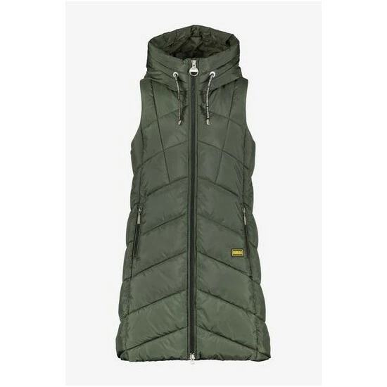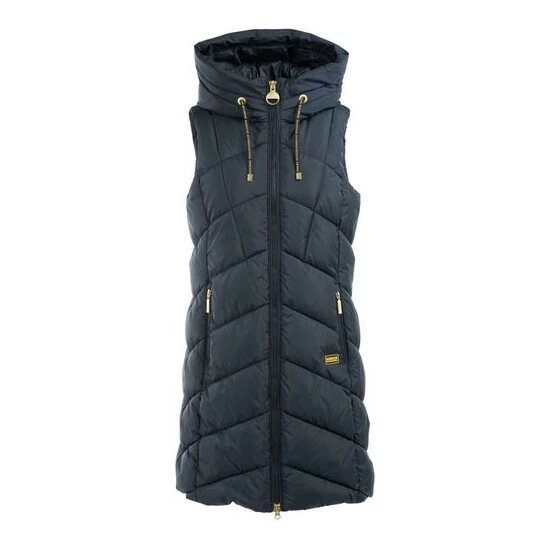 Sporty longline gilet with fixed snorkel hood, black contrasting zips and branded drawcord.
