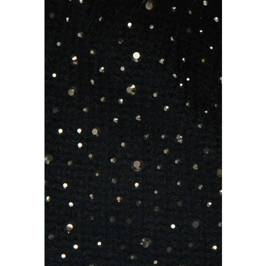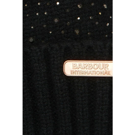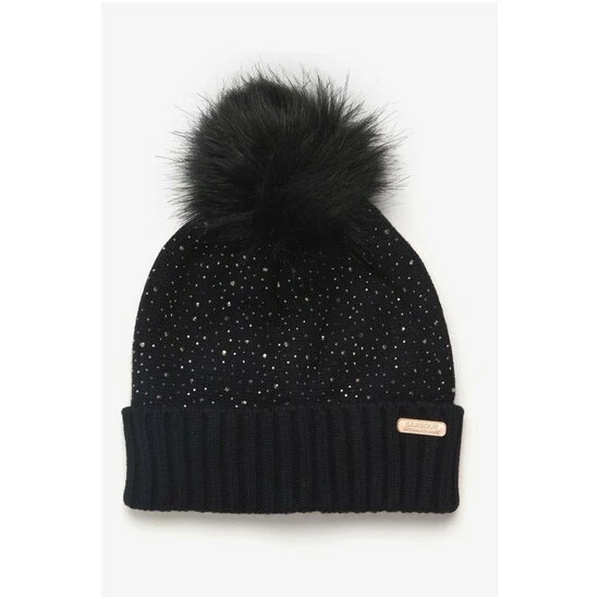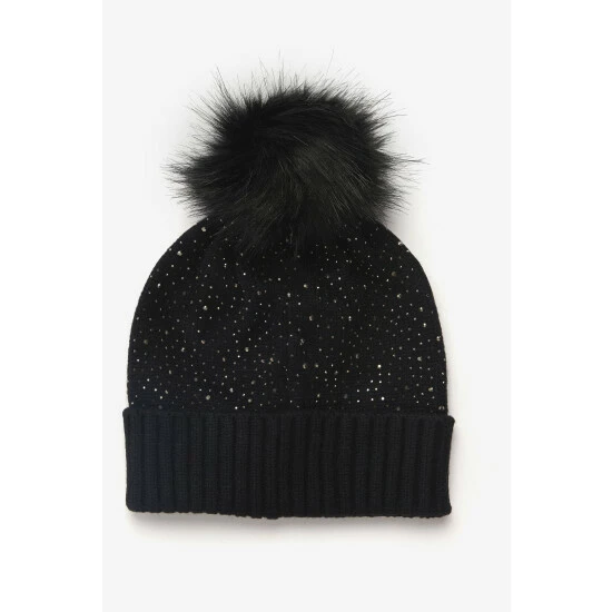 A supersoft knitted beanie featuring all-over diamanté embellishment, turnback hem and faux-fur pom.