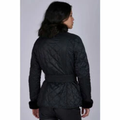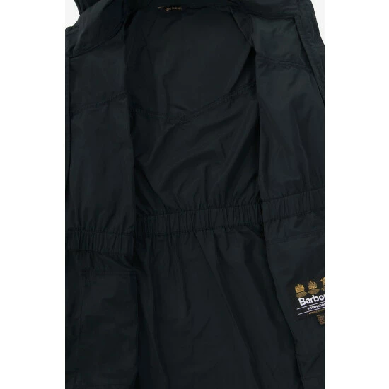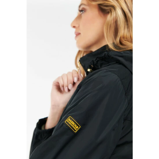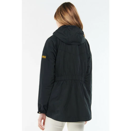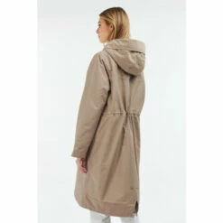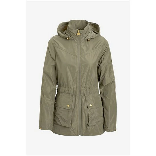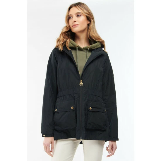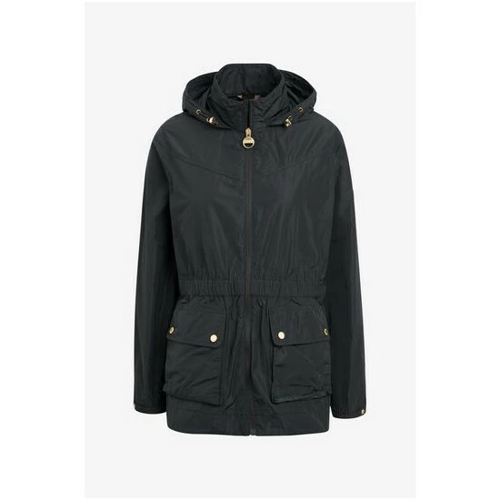 Flattering style with elasticated waist, fixed hood at neckline, bellows pockets with side entry and stud adjustment at cuff.