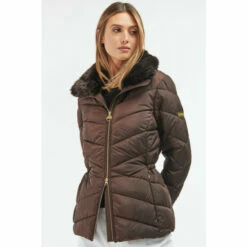 Showcasing a shorter fitted style, the Barbour International Santa Rosa Quilted Jacket boasts an all over chevron design with a detachable faux fur trim to the collar. A drawcord to the back waist offers a feminine fit and while retaining unwavering comfort and functionality. A Barbour International branding to the left sleeve.