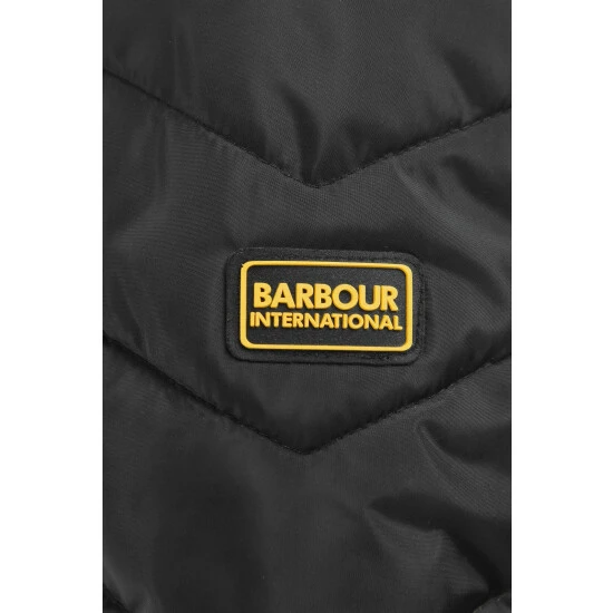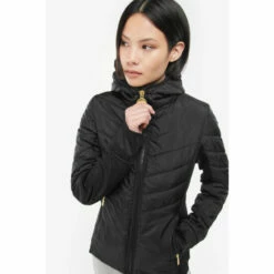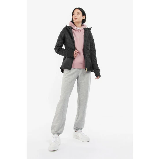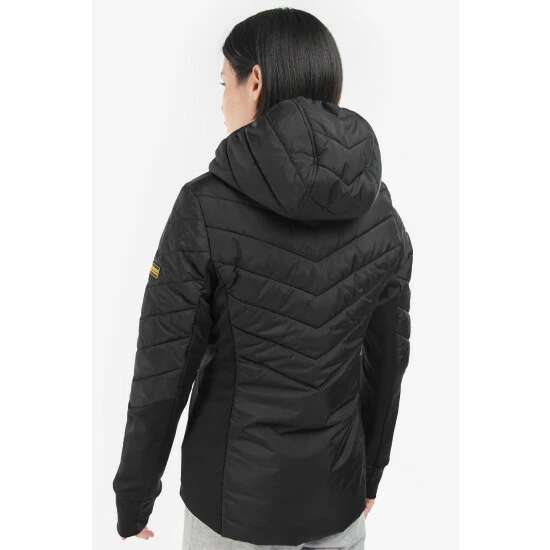 Sporty, chevron quilted style with contrasting unquilted panels and sweat fabric to the sleeves and side body. This style has a fixed hood and zip pockets.