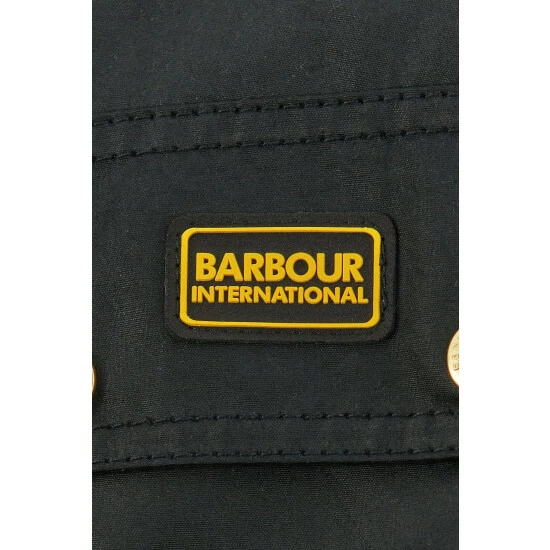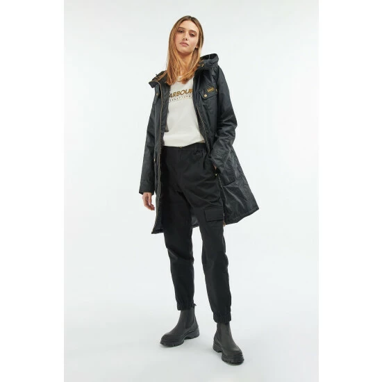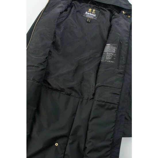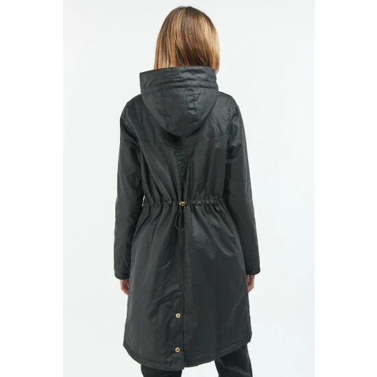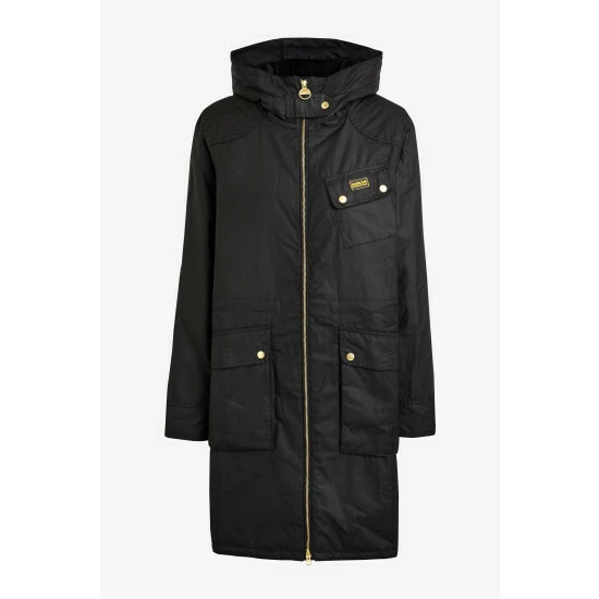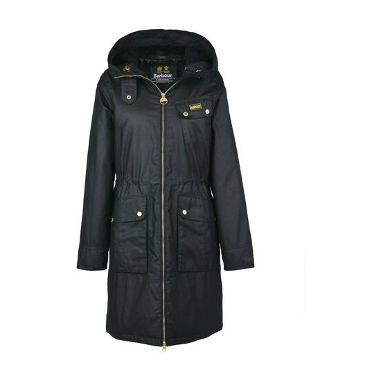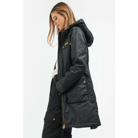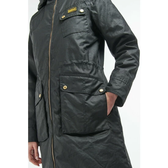 Longer length wax style with signature slanted chest pocket and oversized bellow pockets, throat tab and studded back vent. Waist drawcord exiting at outer back to cinch.