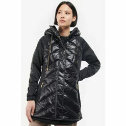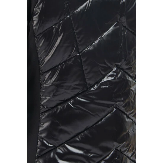 Longer length chevron quilted style with sweat panels to the sleeves and side body. This style has zip pockets and a fixed hood with branded drawcord.