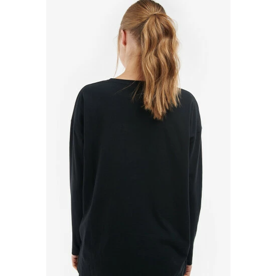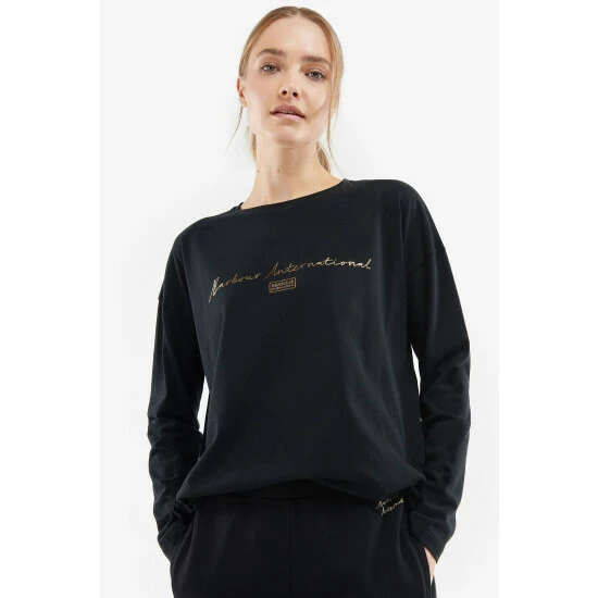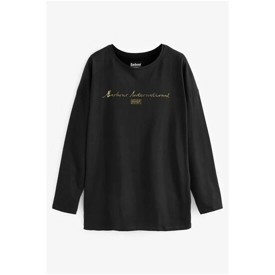 Long sleeve cotton t-shirt with dropped shoulder and Barbour International foil printed script and lozenge graphic to chest.