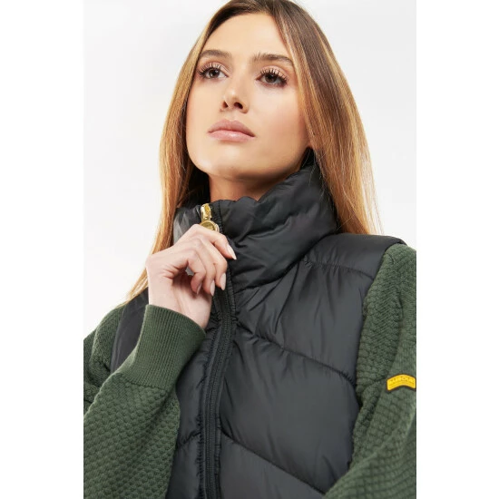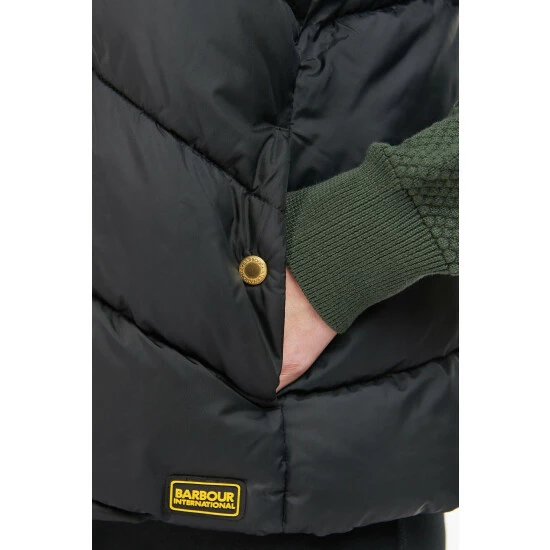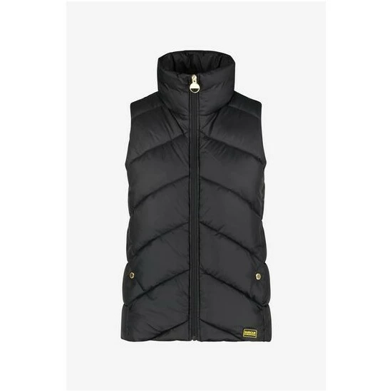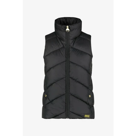 Baffle quilt gilet with diverted side seams, stud fasten pockets and BI badge to lower hem
